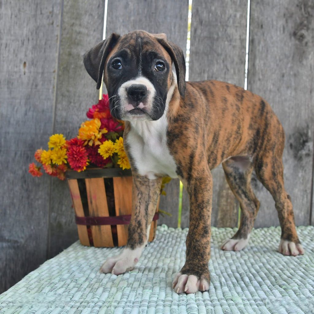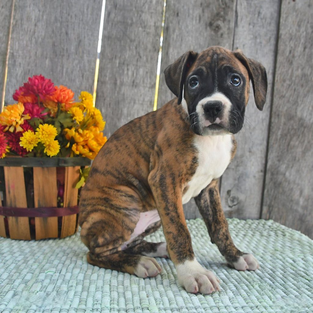 Meet Dad: Buddy is a striking Boxer with an energetic, fun-loving personality. He’s athletic, social, and full of charm. Duke brings boldness, smarts, and a great Boxer grin to all his pups.