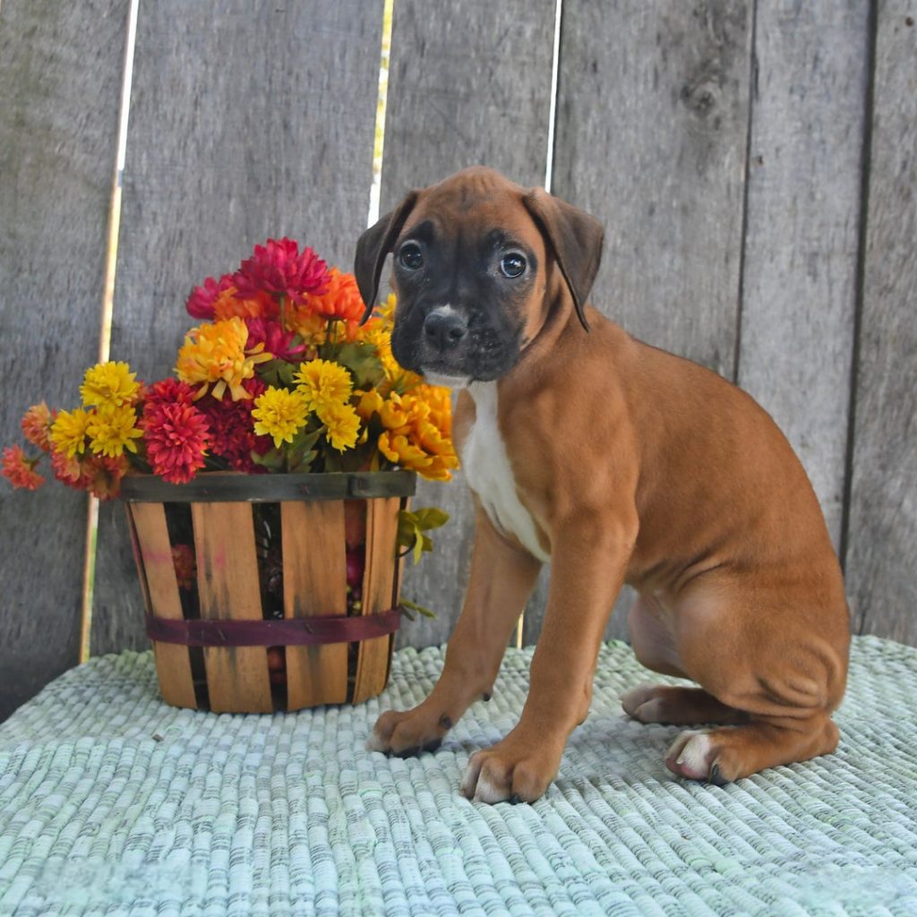Meet Dad: Buddy is a striking Boxer with an energetic, fun-loving personality. He’s athletic, social, and full of charm. Duke brings boldness, smarts, and a great Boxer grin to all his pups.