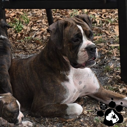 Shyann is my little Alpha…she does is so subtly though. She has this act about being so sweet and kinda shy…NOT. It doesn’t matter if it’s a sister or male, what she says goes. She is the a little heavier than some of her sisters, she weighs in at about 65 to 68 lbs.  Her fawn coat and black mask is the perfect classic Boxer look. She loves playing with the grand kids, and their weird way of playing fetch keeps us laughing.
