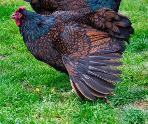 The most common Barnevelder feather pattern in the United States—and the only variety recognized by the American Poultry Association (APA)—is the Double Laced variety. These chickens are gorgeous with greenish-black and dark gold feathers. The hens’ body feathers are dark gold with greenish black lacing.