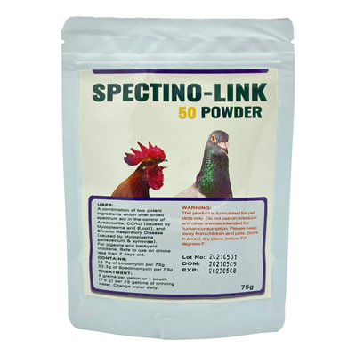 Spectino-Link 50 Powder for Birds is a generic form of LS-50 which contains two potent ingredients that offer broad spectrum aid in the control of airsacculitis, Chronic Respiratory Disease (caused by mycoplasma), and CCRD (caused by Mycoplasma and E.coli). Spectino-Link 50 contains Lincomycin and Spectinomycin which is safe to use on chicks less than 7 days old. It may be used on pigeons, backyard chickens, quail, and other game birds.